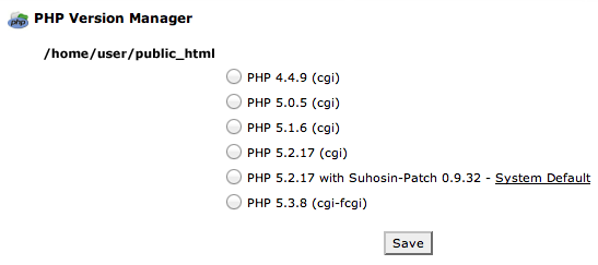 Per cambiare la versione di PHP di cui hai bisogno per il tuo account basta un singolo click: nel cPanel vai su PHP Version Manager e potrai scegliere la versione di PHP che desideri eseguire in ogni directory.